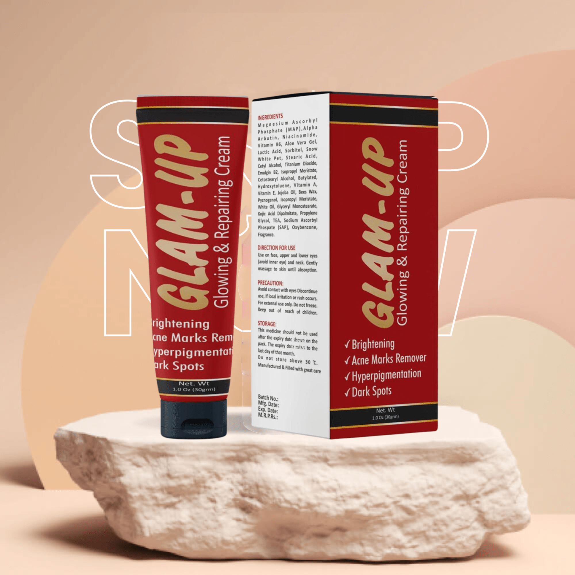 Achieve a radiant and flawless complexion with Glam-Up Glowing & Repairing Cream. This advanced skincare formula is designed to brighten your skin, reduce acne marks, and target hyperpigmentation and dark spots. Infused with powerful ingredients like Magnesium Ascorbyl Phosphate (MAP), Alpha Arbutin, and Niacinamide, it works to rejuvenate and repair your skin, leaving it smooth and glowing.